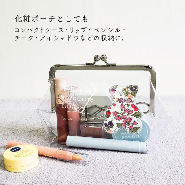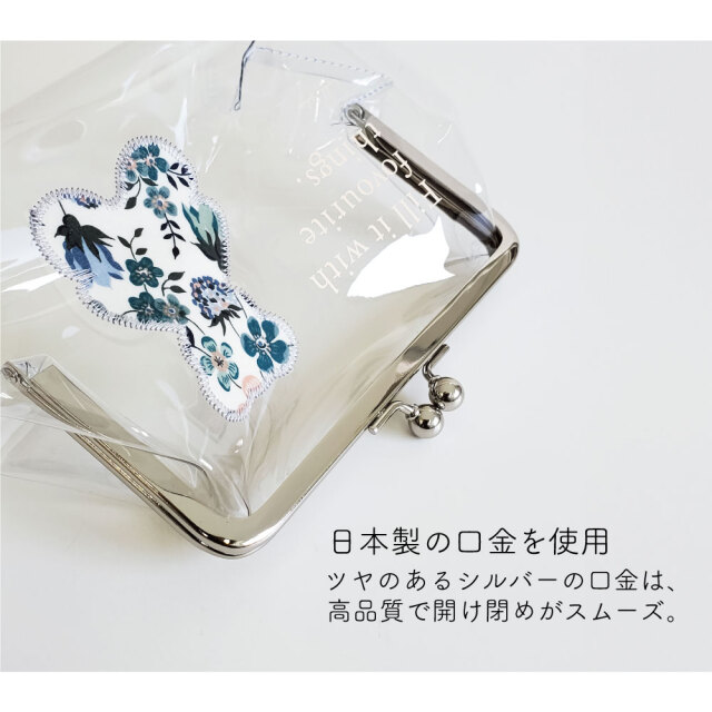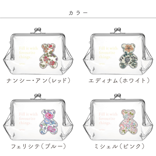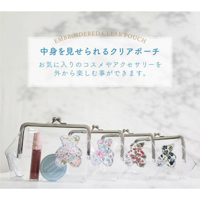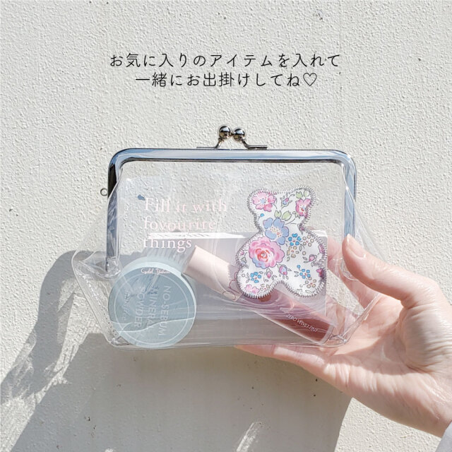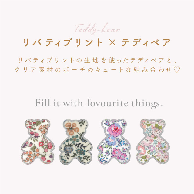 爽やかなビニール素材に英字プリントとベアーの形のリバティ生地を刺繍でふちどったおしゃれなデザインです。中にお気に入りのコスメやアイテムを入れて、わざと見せるのもおしゃれです。