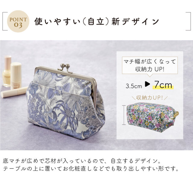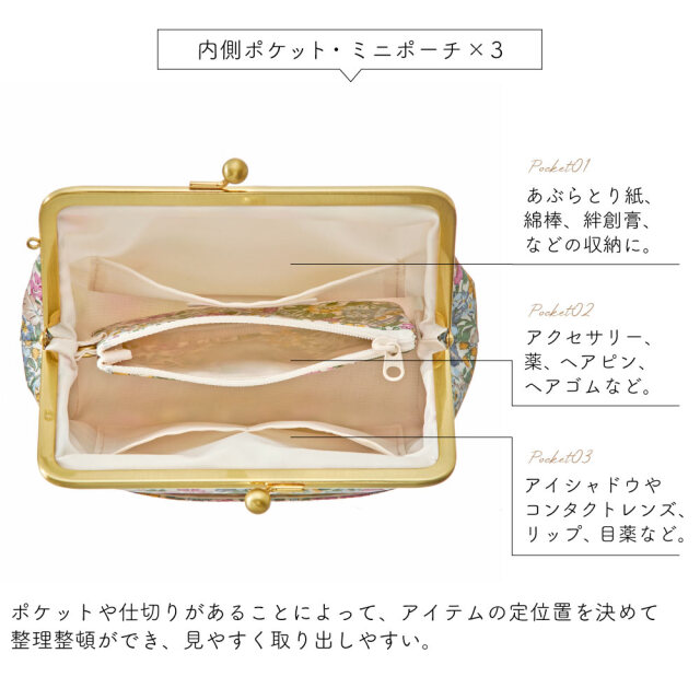 人気のがま口ポーチに整理整頓もはかどるポケットを増やし、底はしっかりしたマチで安定して自立しやすくなりました。