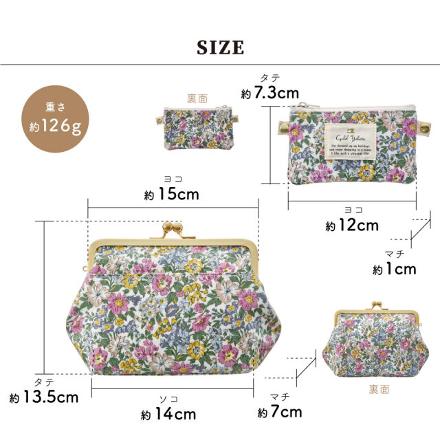 ●サイズ(約):本体 タテ 13.5cm × ヨコ 20cm (開口部分15cm) × マチ 7cm