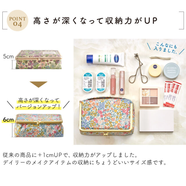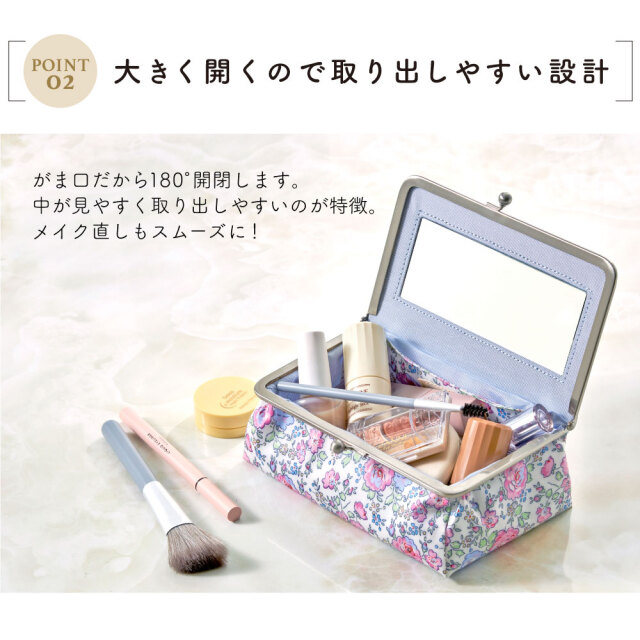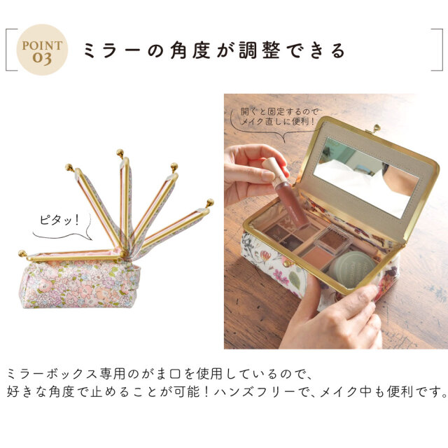 ミラーの角度を変えられ、大きく開くがま口で中のアイテムを取り出しやすい使い勝手の良さはそのままに、ちょっとだけ深くして収納力もUP。