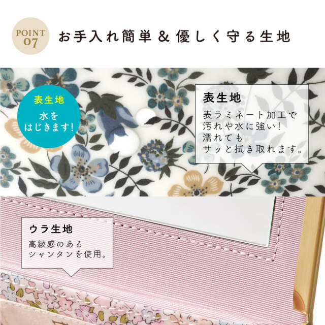 表生地はラミネート加工で汚れや水に強く濡れてもさっと拭きとれてお手入れも楽々です。