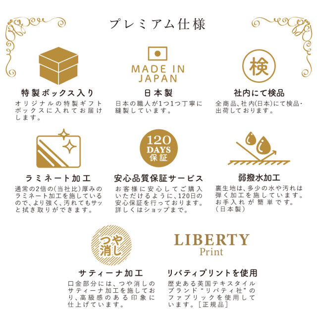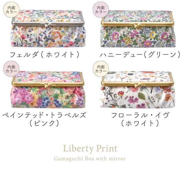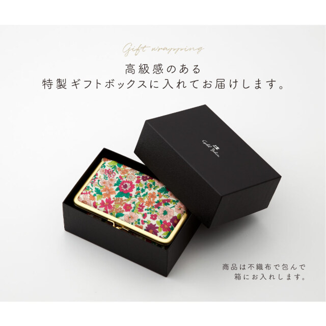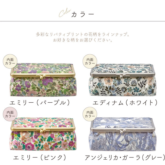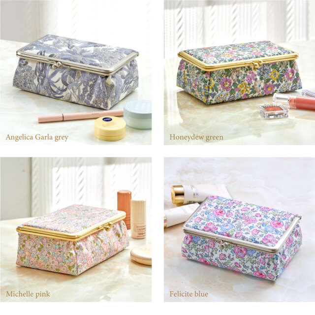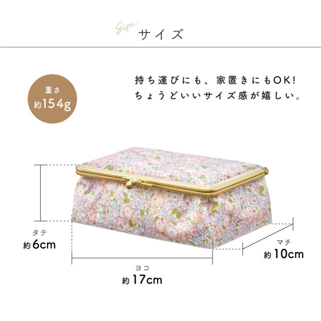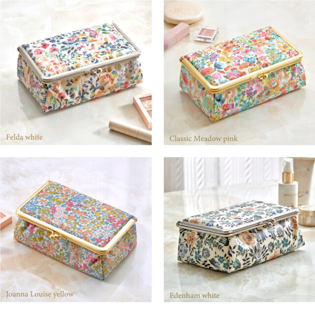 多彩な花柄プリントが美しいリバティプリントと上品で高級感のあるサティーナ加工のがま口を使用したこだわりのBOX型のポーチはお気に入りのコスメや大事なアイテムを入れるのに特別感があります。