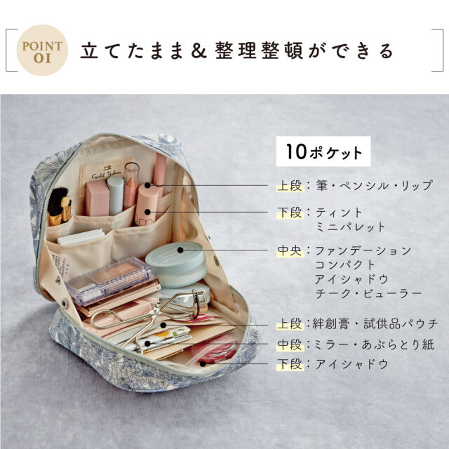 コスメにこだわりのある方はもちろん、整理整頓が苦手な方にもアイテムの定位置を決められるので見た目もきれいに収納できるおすすめポーチです。