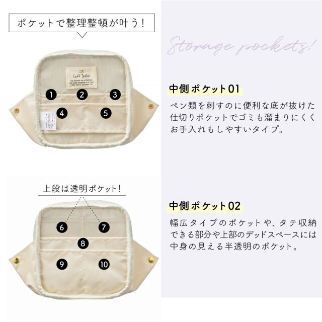 もう片面は幅広タイプのポケットや縦収納でできる上部のデッドスペースに中身の見える半透明のポケットをつけました。
