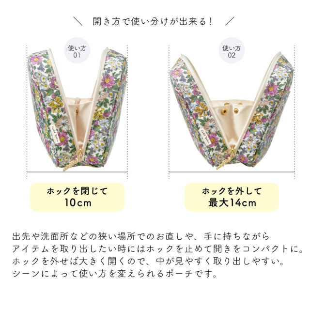 出先や洗面所などの狭い場所でのお化粧直しや手に持ちながら中のアイテムを取り出したいときはホックを止めて開きをコンパクトにできます。