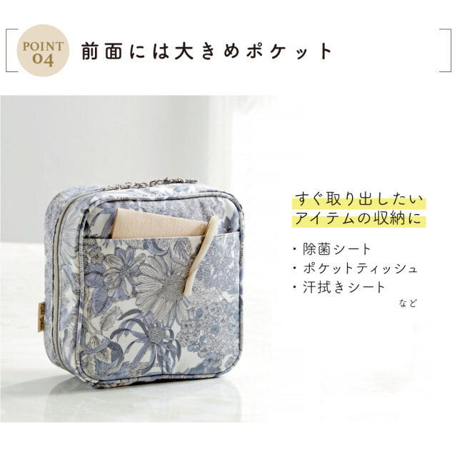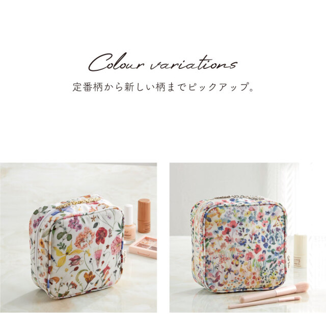 ダブルファスナー仕様で大きく開くので朝のお化粧タイムや外出先でのお直しなどでもアイテムがひとめにわかって取り出しやすくメイク時もスムーズ。