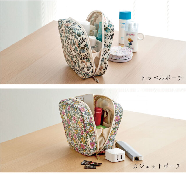 大小さまざまなポケットや仕切りがたくさんついたポーチはどこに何を入れようか考えるだけでもわくわくします。