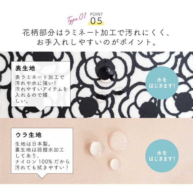 花柄表面は、ラミネート加工で汚れにくく、多少の水も弾くので汚れたらさっと拭けてお手入れも楽々。