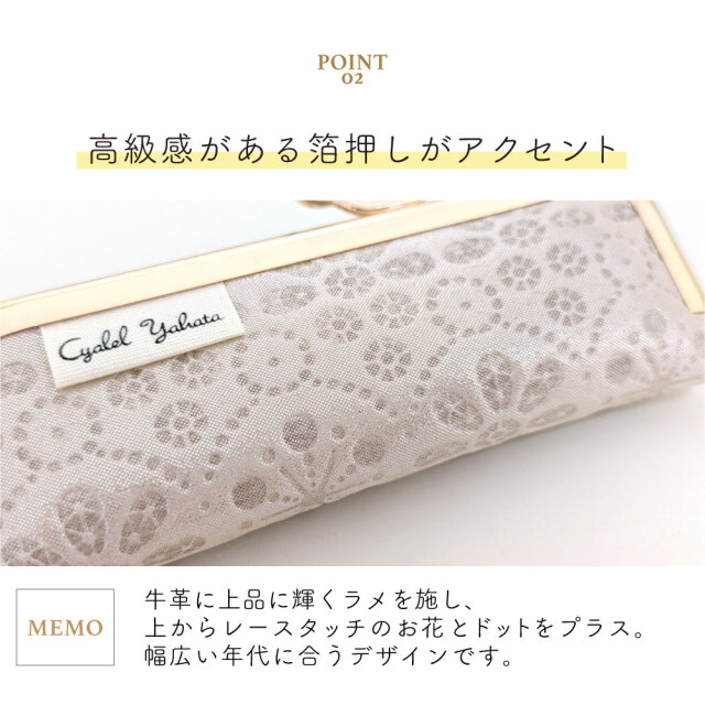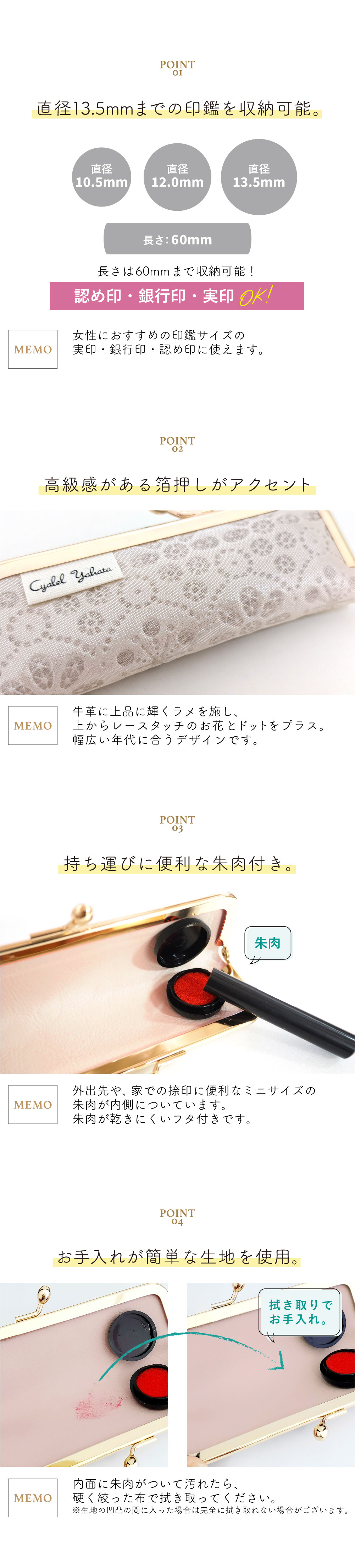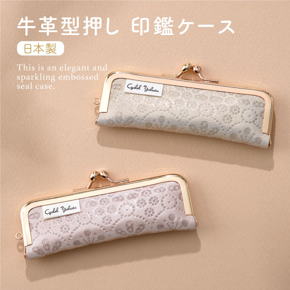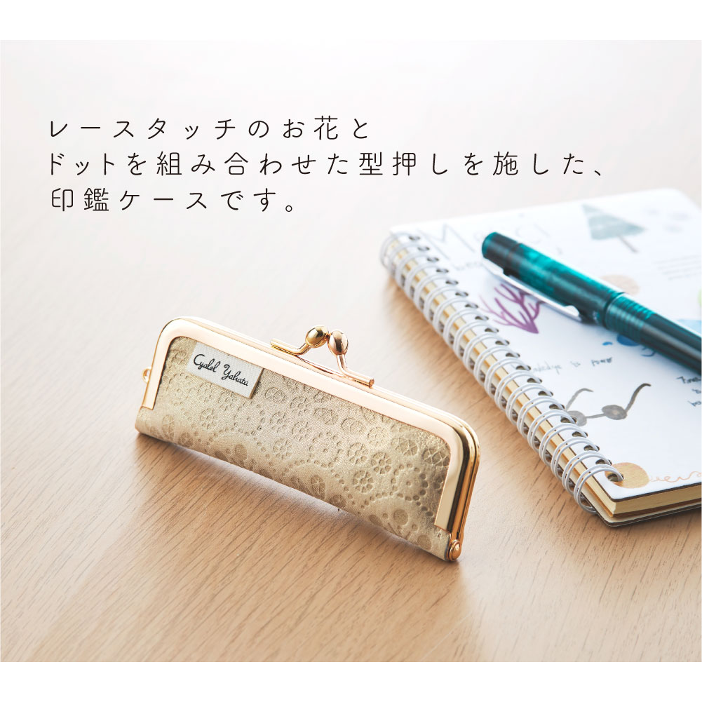 キラキラのメタリックレザー(本革)にレースタッチのお花とドットを組み合わせた型押しを施した、印鑑ケースです。