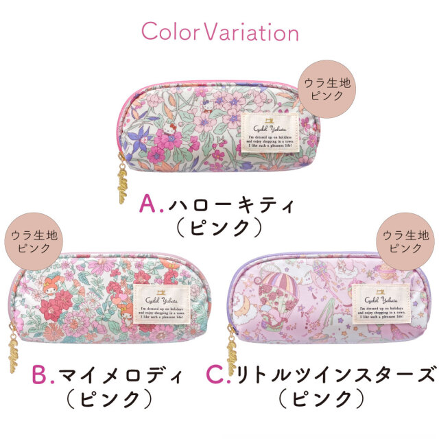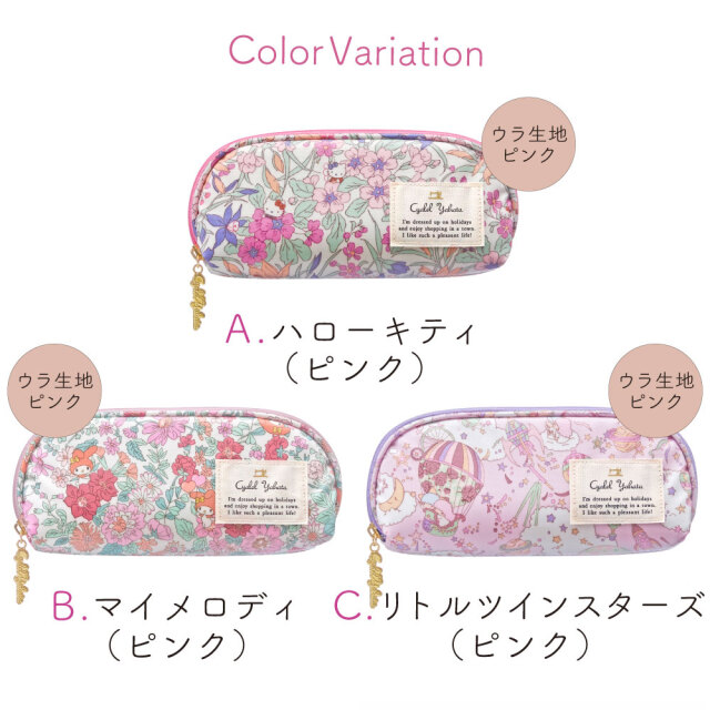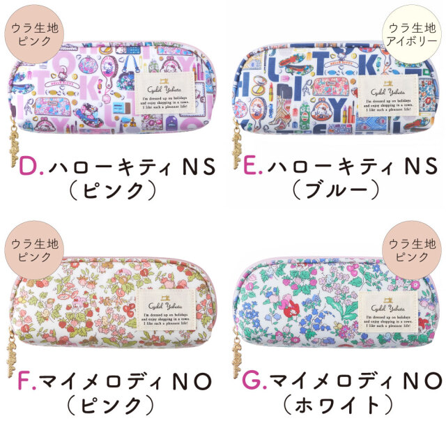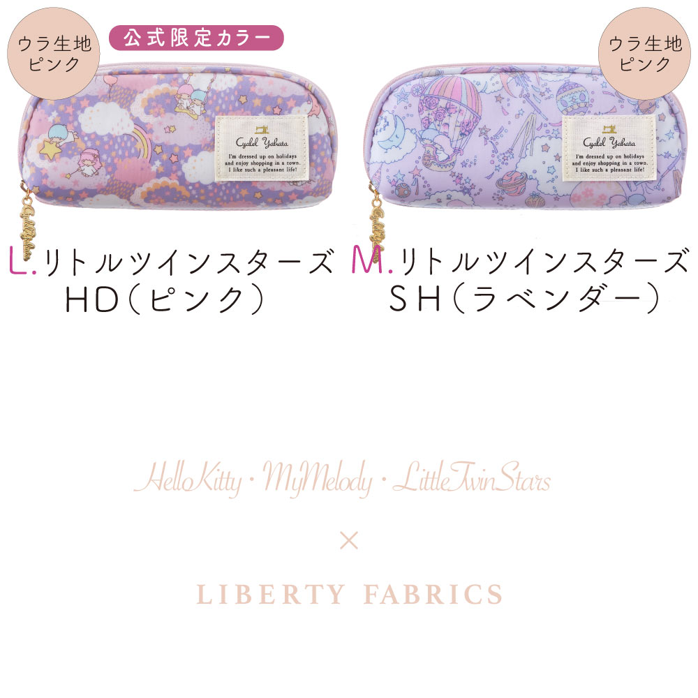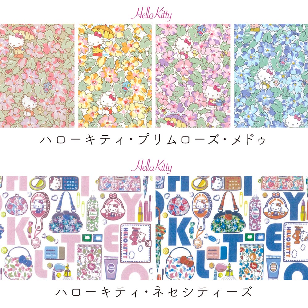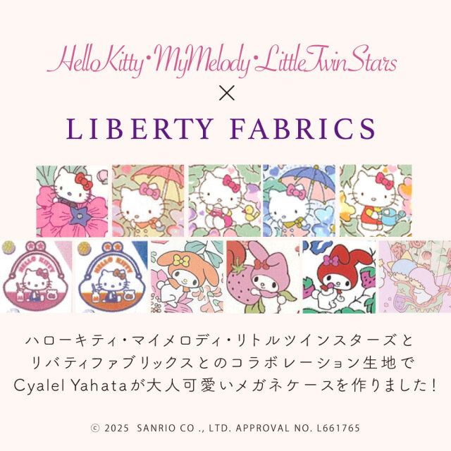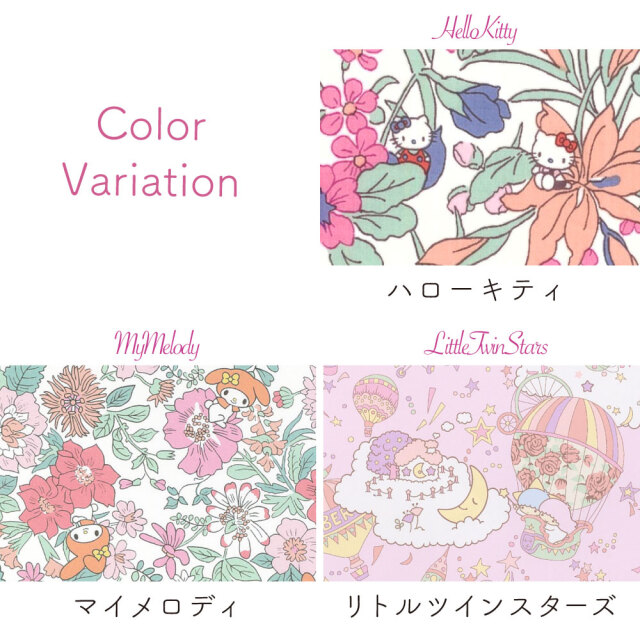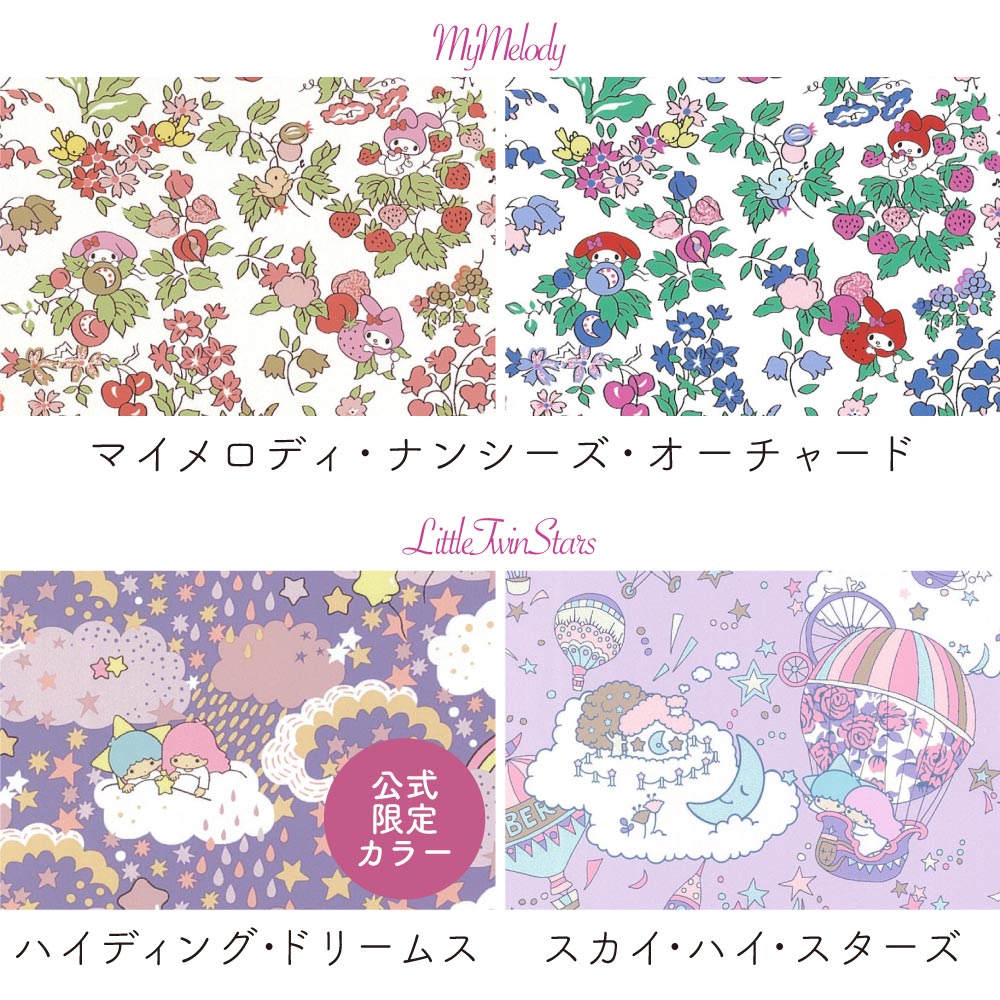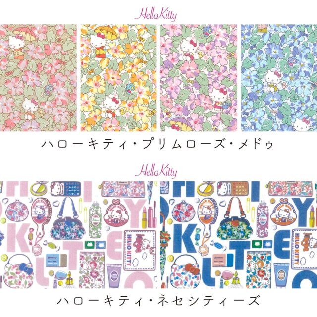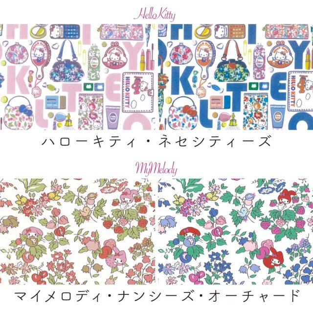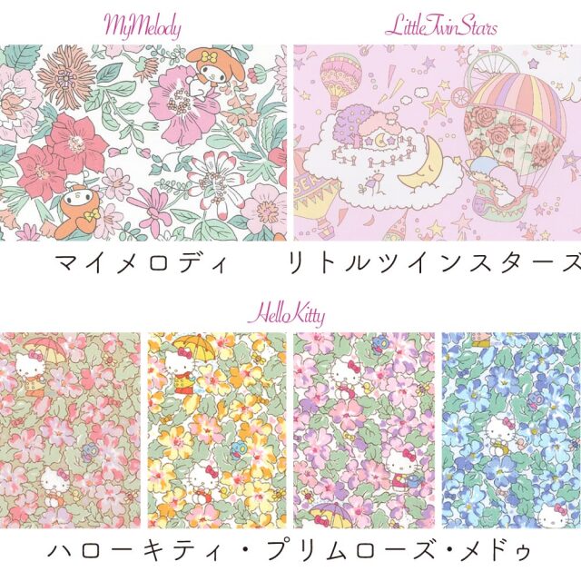 サンリオキャラクターの、ハローキティ・リトルツインスターズ・マイメロディがリバティプリントとコラボした生地を使った、