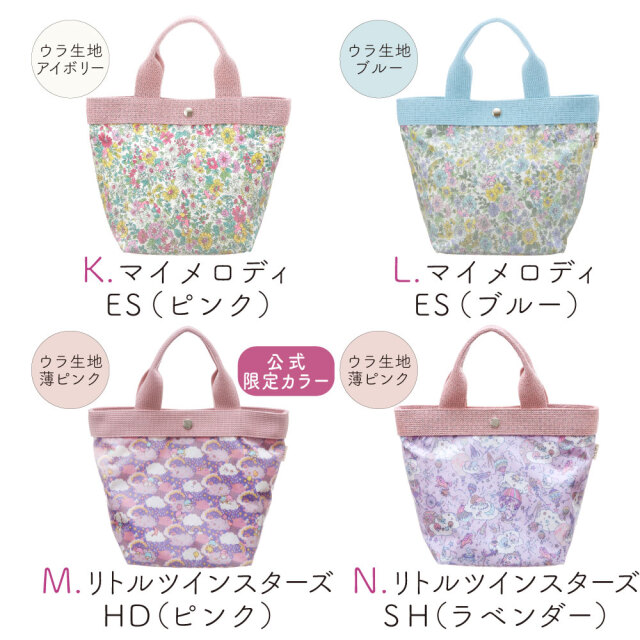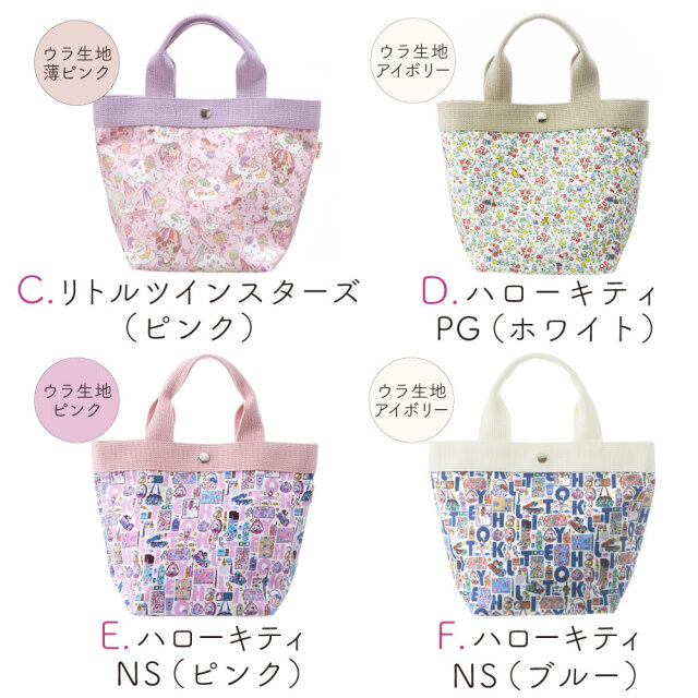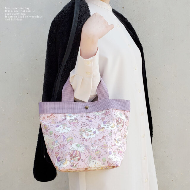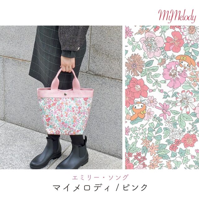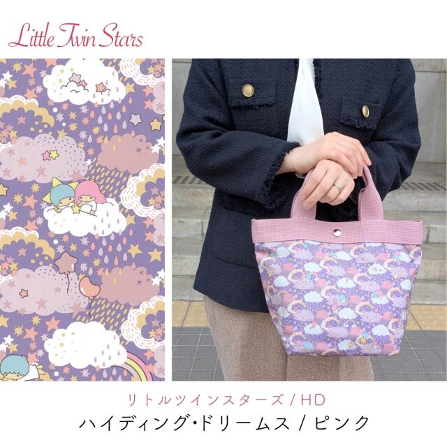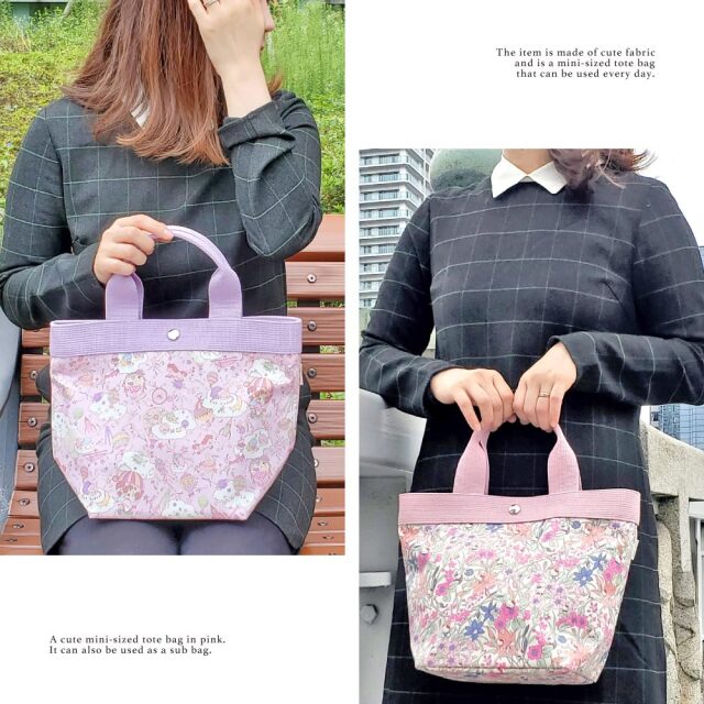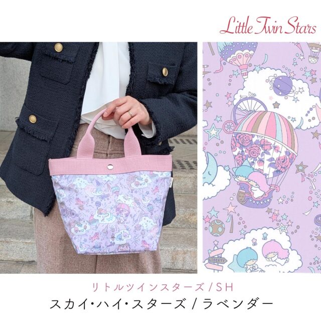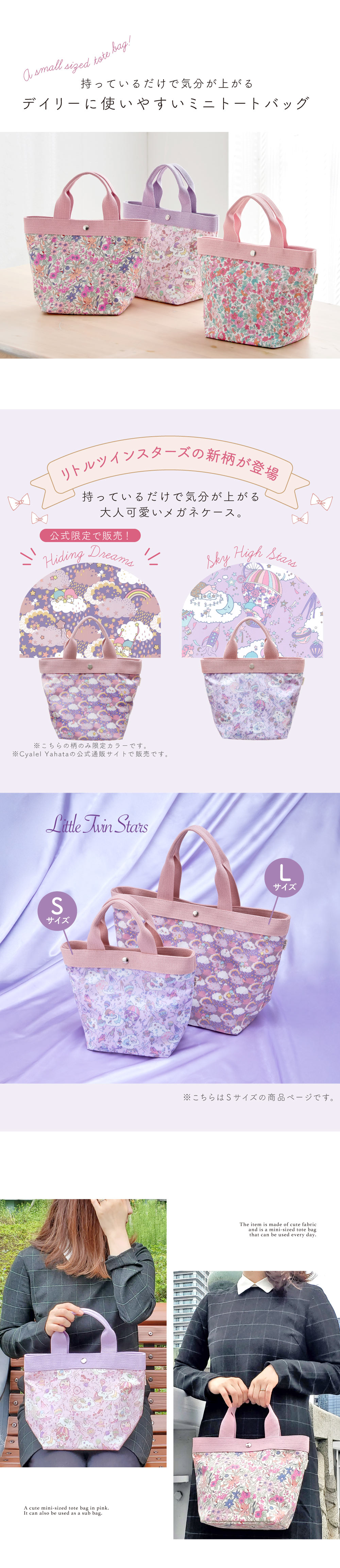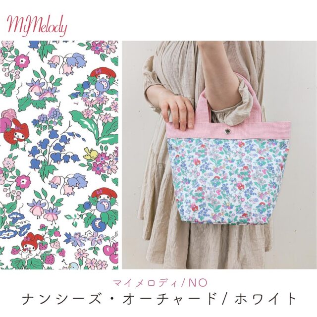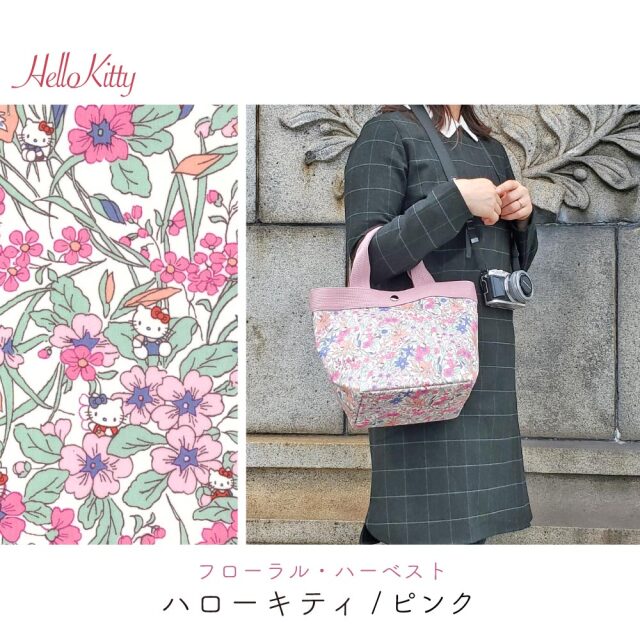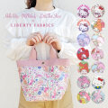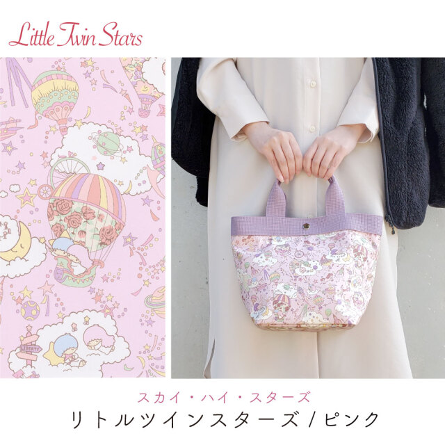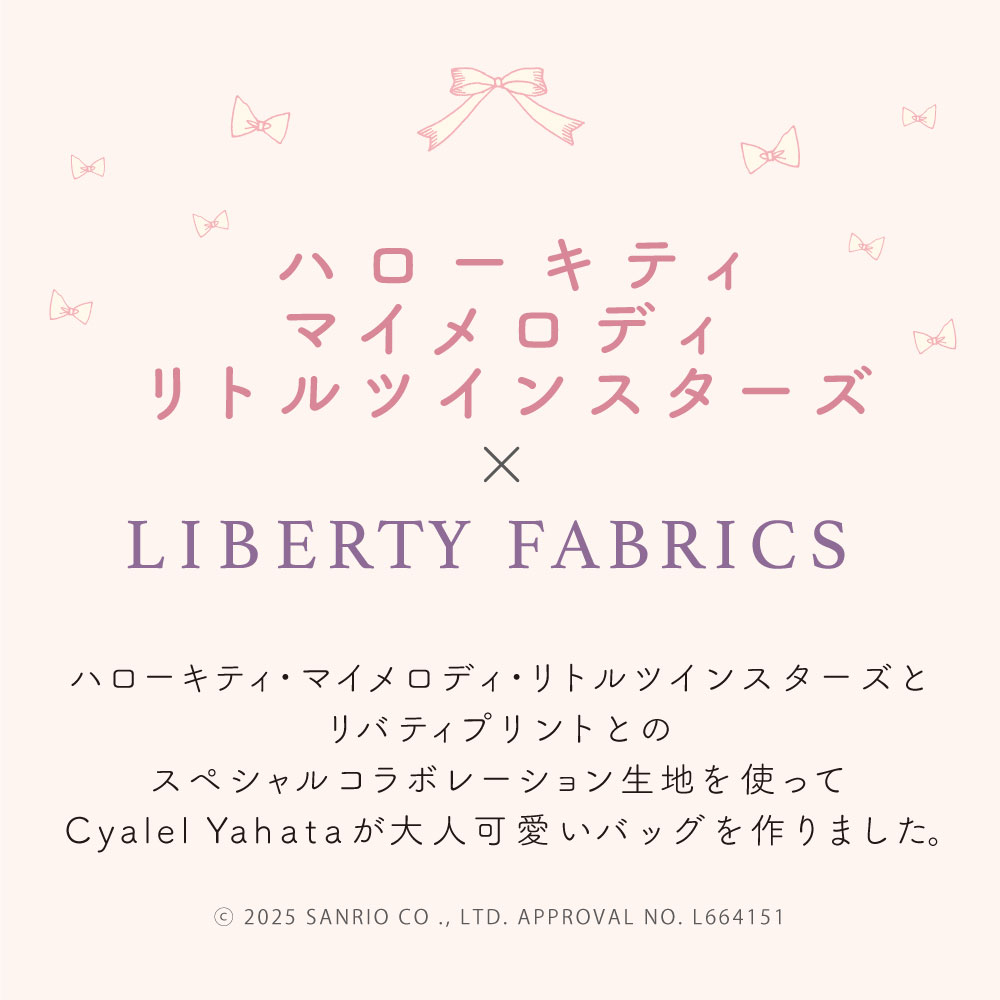 サンリオキャラクターの[ハローキティ・マイメロディ・リトルツインスターズ]と、[リバティプリント]がコラボした生地を使用したミニサイズのトートバッグです。。