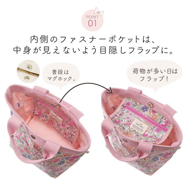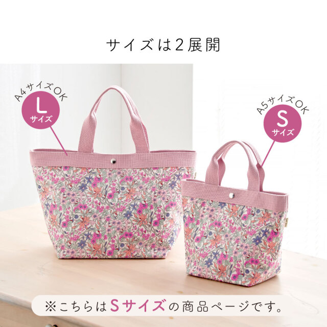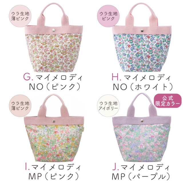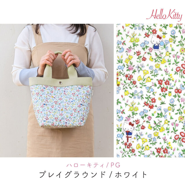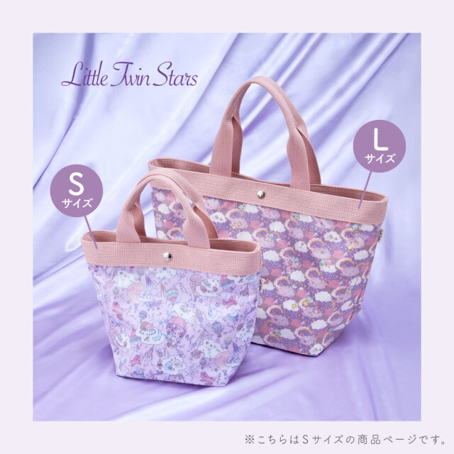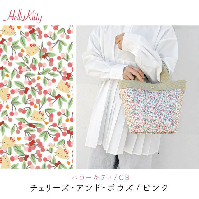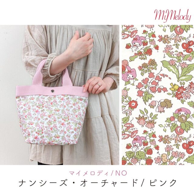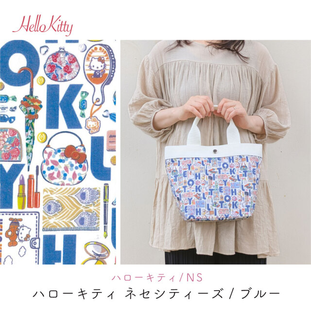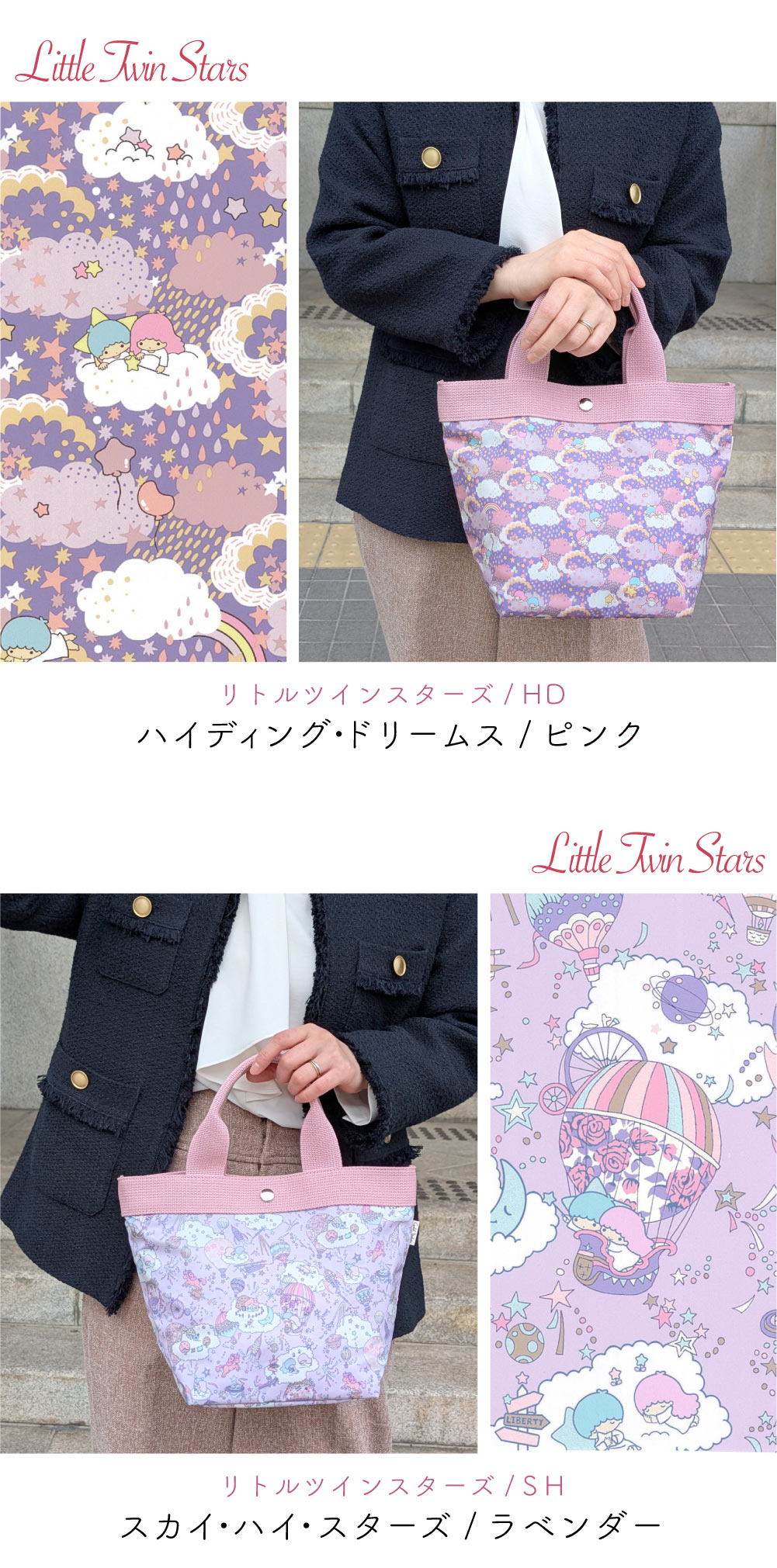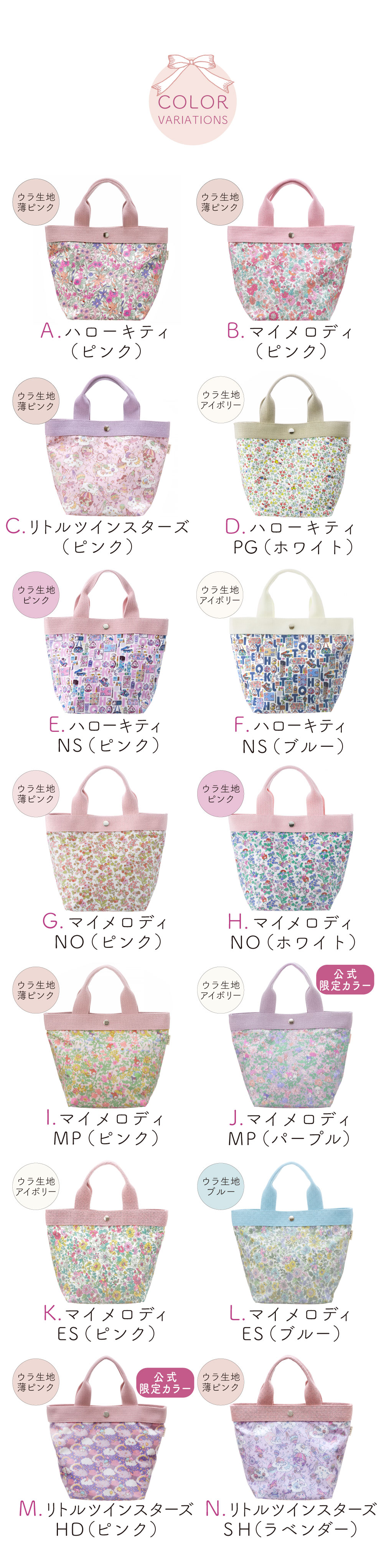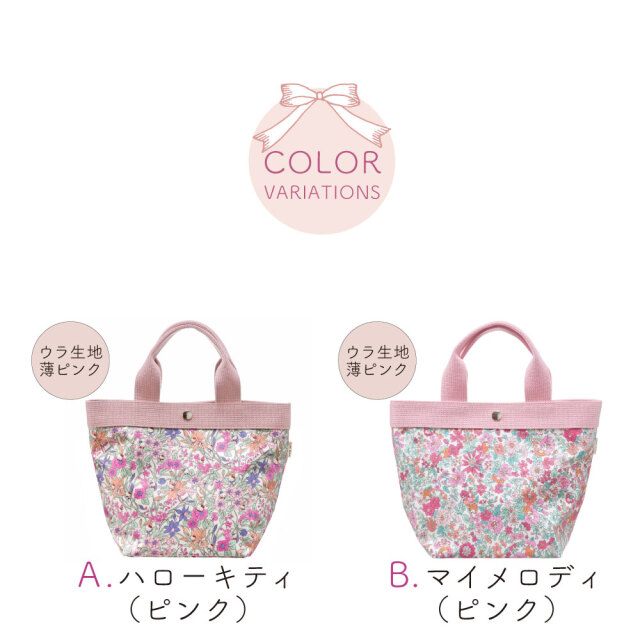 サンリオキャラクターの[ハローキティ・マイメロディ・リトルツインスターズ]と、[リバティプリント]がコラボした生地を使用したミニサイズのトートバッグです。。