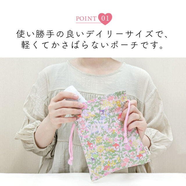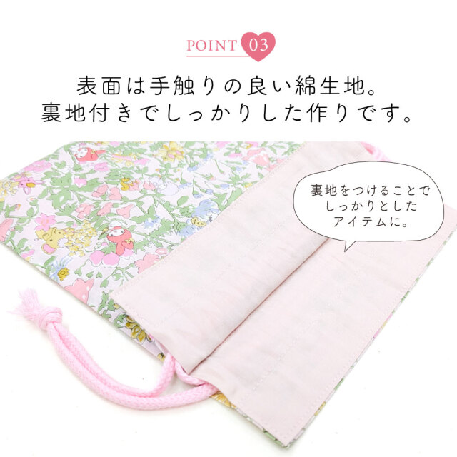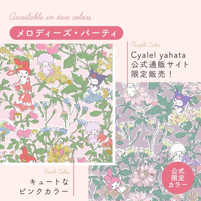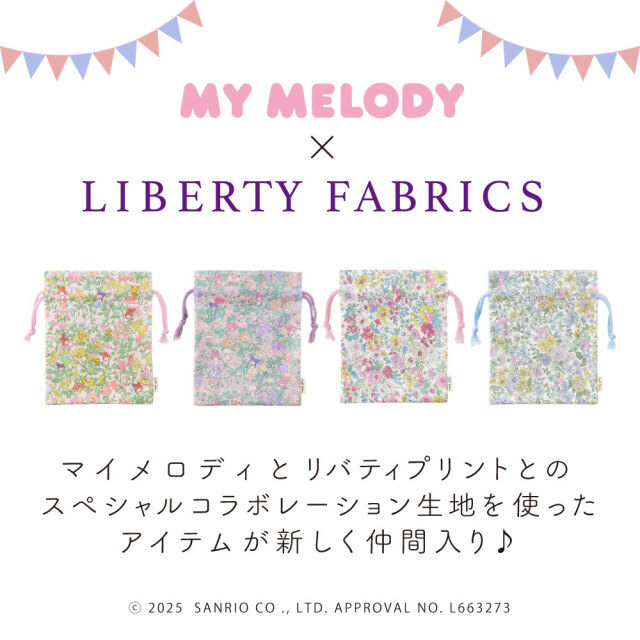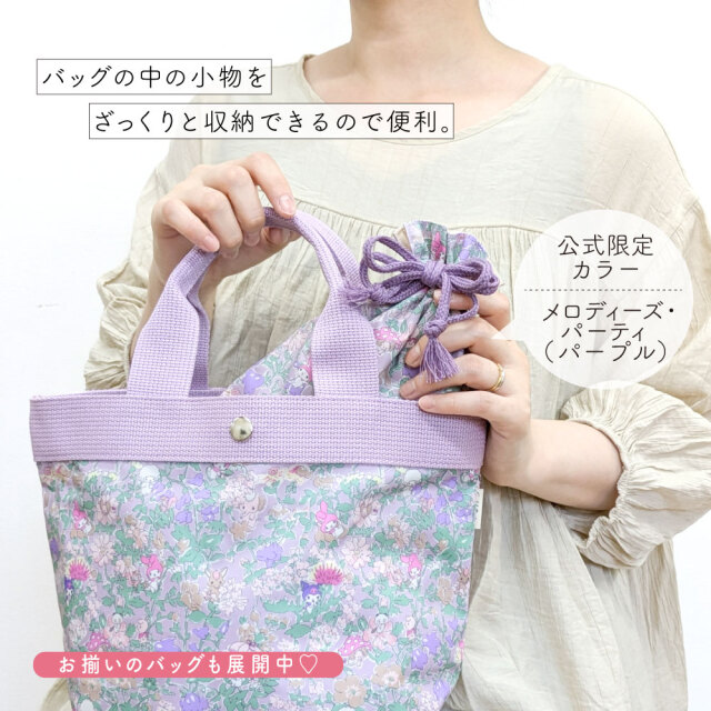 Cyalel yahata(シャレールヤハタ)のマイメロディとリバティプリントがコラボした生地「メロディーズ・パーティ」、「エミリー・ソング」柄が大人可愛い巾着袋です。