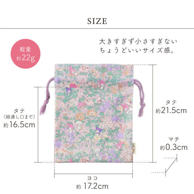 ●サイズ(約):本体 タテ21.5cm(紐通し口まで約16.5cm) × ヨコ 17.2cm × マチ0.3cm